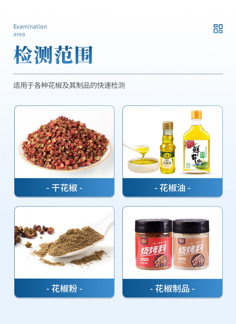 1. 樣品檢測范圍:花椒5-30mg/g 花椒油 0.6-3mg/g;
