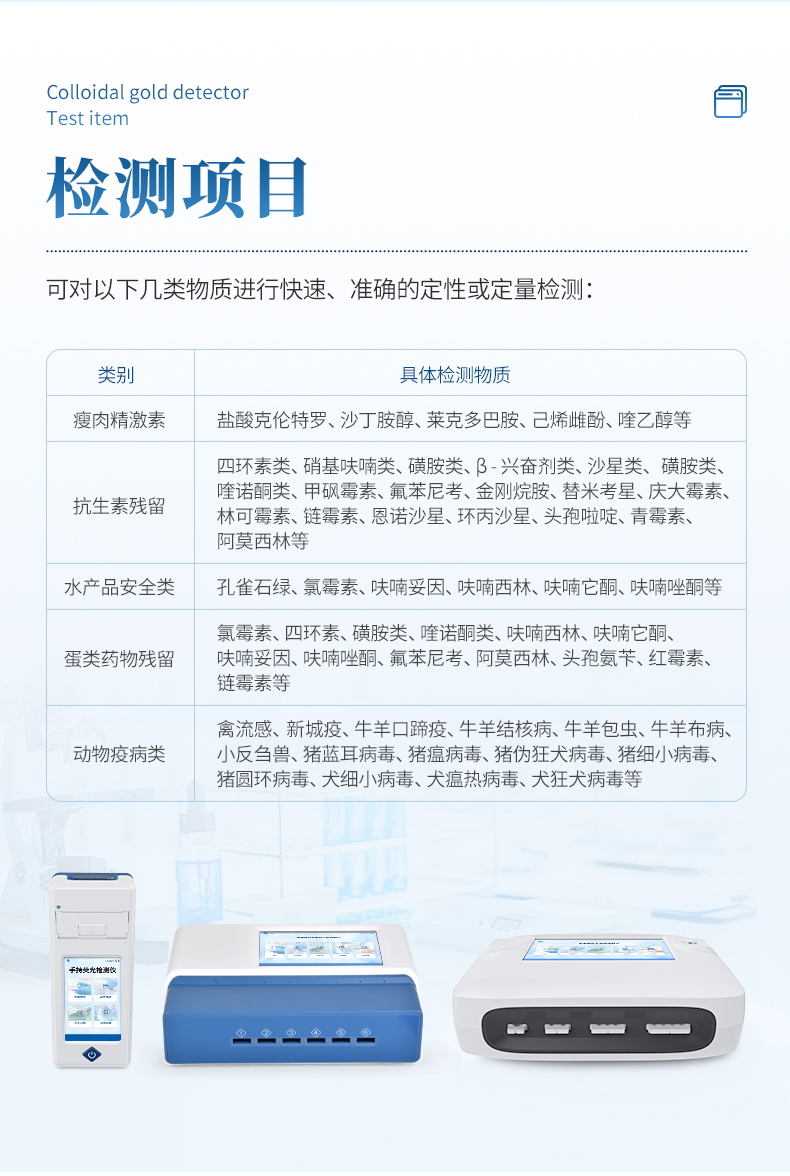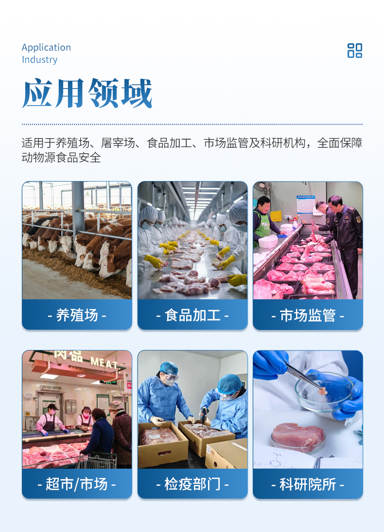 該獸藥殘留檢測儀適用于豬、雞、鴨、羊、牛、牛奶等畜禽肉產品中獸藥殘留,包括抗生素類殘留、瘦肉精激素類殘留和水產品有毒有害物質的現場快速篩查定及定性定量檢測。 該多功能獸藥殘留檢測儀為集成化肉品安全快速檢測分析設備,可廣泛應用于畜牧養殖場、屠宰場、食品肉產品深加工企業、食藥監局、檢驗檢疫部門、衛生部門、高教院校、科研院所、農業部門等單位使用。