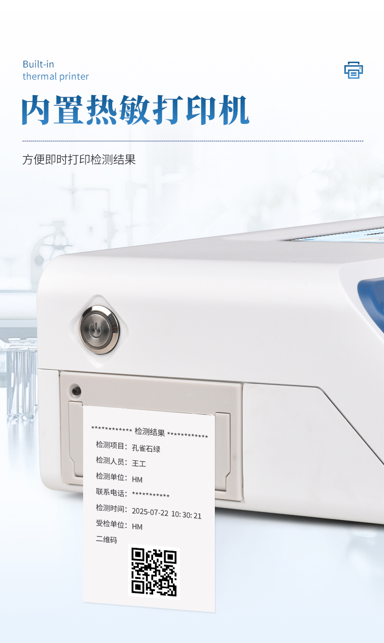 16、檢測結果:報告出檢測項目、被測物質的結果、檢測單位、被檢查單位、檢驗員、檢測時間、檢測限等信息可在觸摸屏上顯示,可通過儀器內置打印機輸出